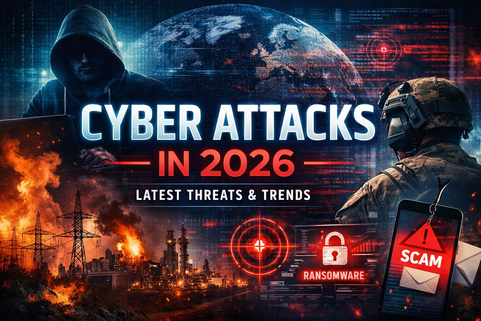 Illustration showing global cyber attacks in 2026, with visuals of ransomware alerts, hackers, critical infrastructure disruption, and digital threat indicators.